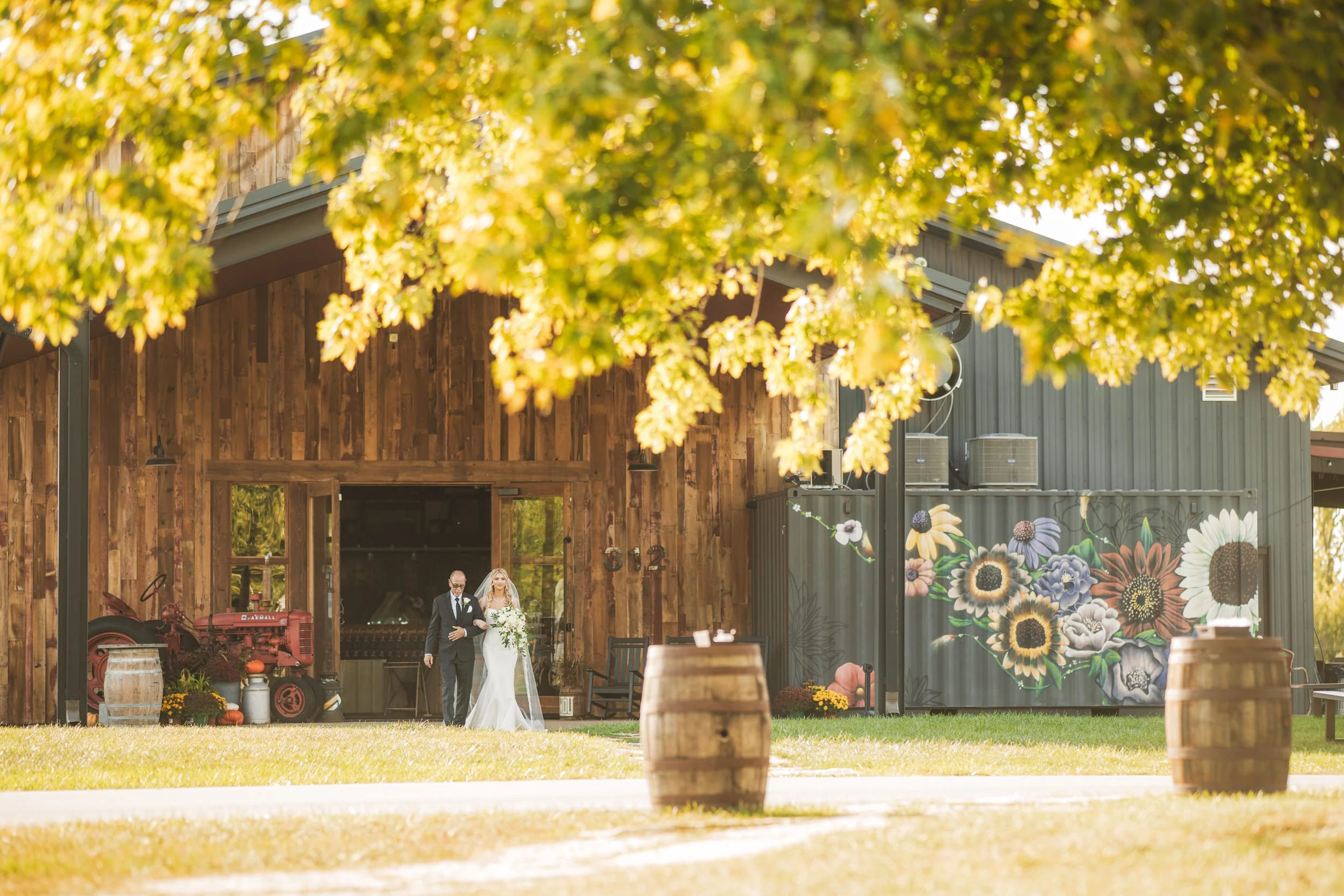 Dad walks his daughter out of The Design Barn for the outdoor ceremony in early October.