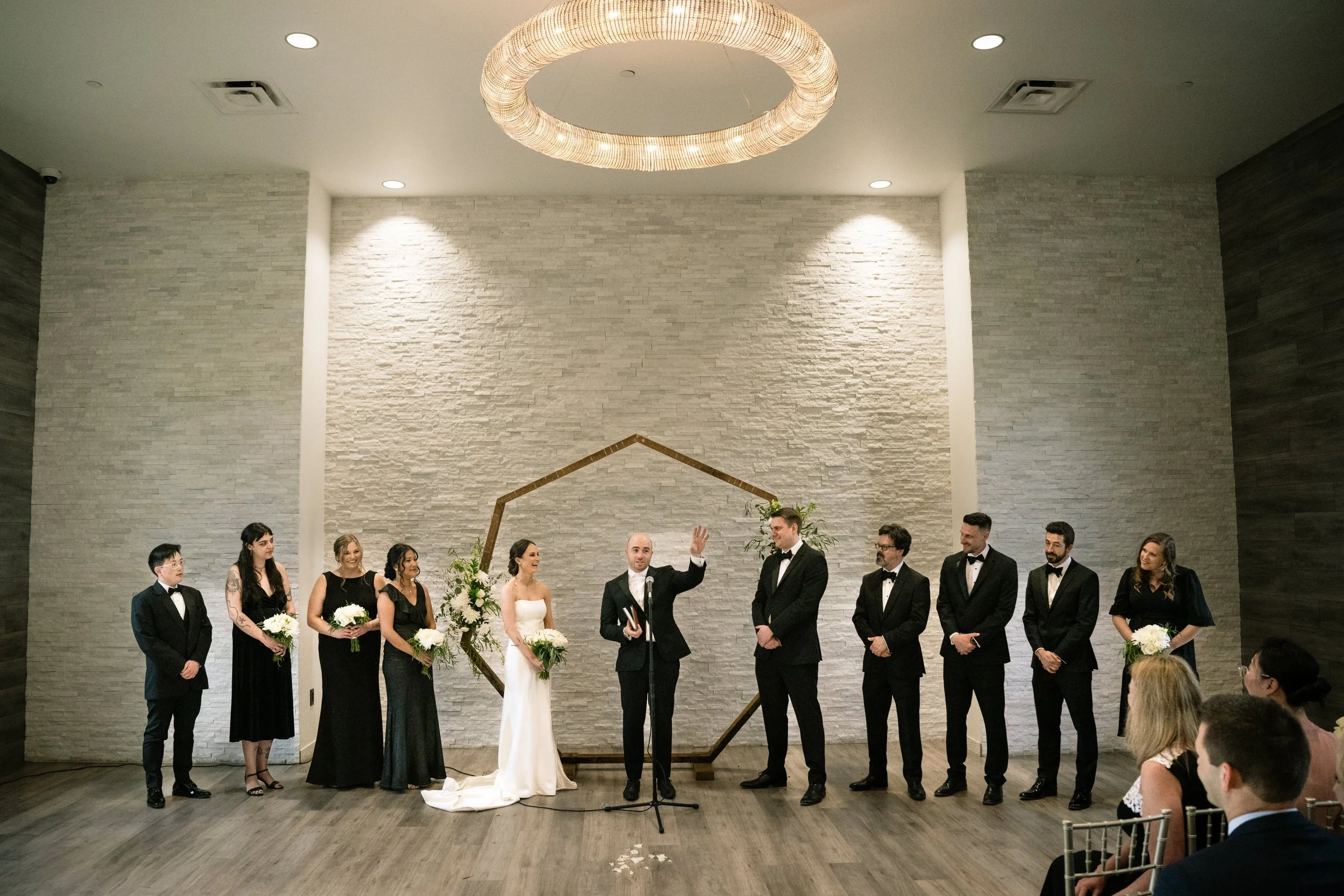The Allure On The Lake has a striking ceremony room with signature chandeliers and stenciled windows that let in natural light. Guests are seated in elegant chairs in two rows, with the wedding party and couple at the front of the room as the center of attention.
