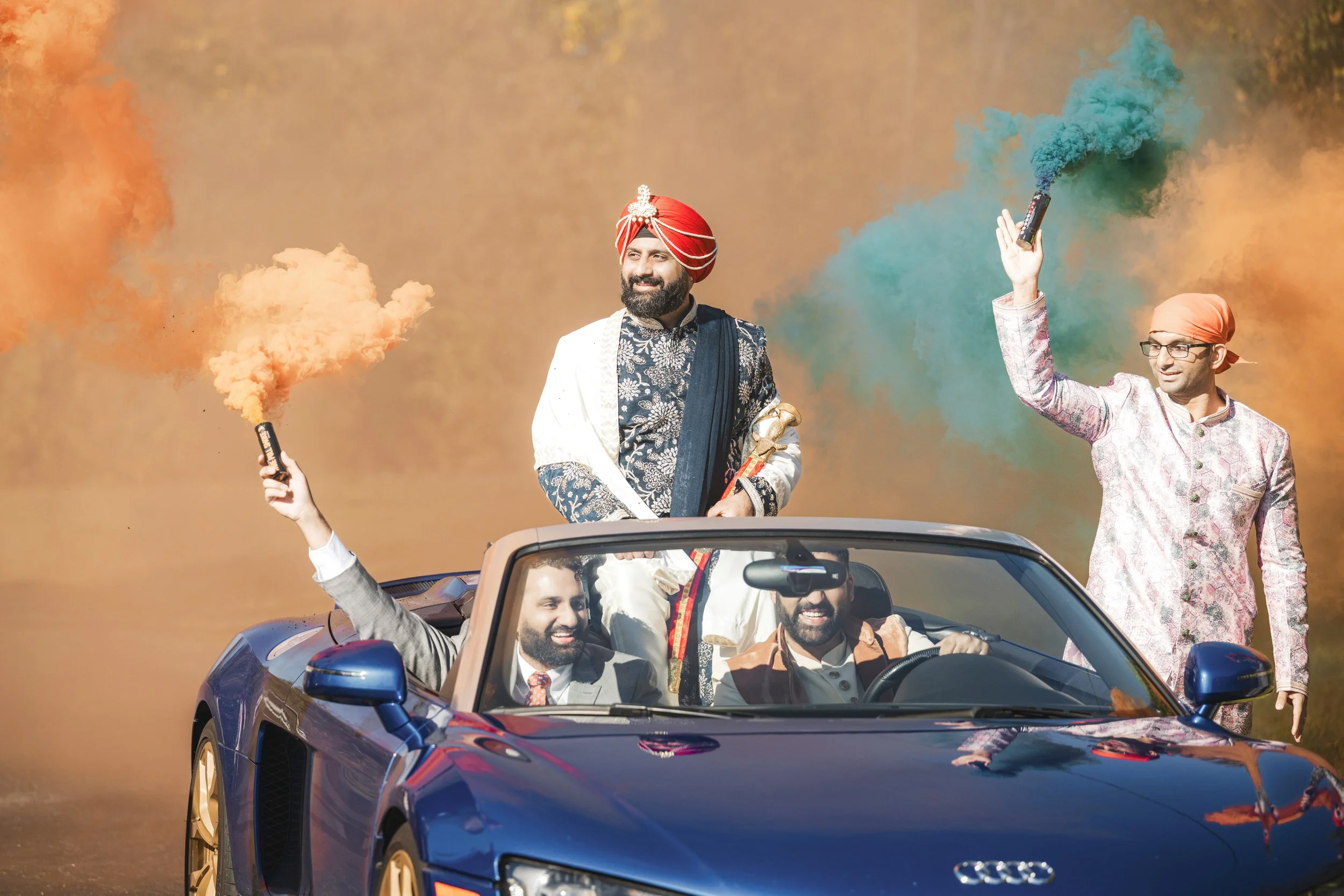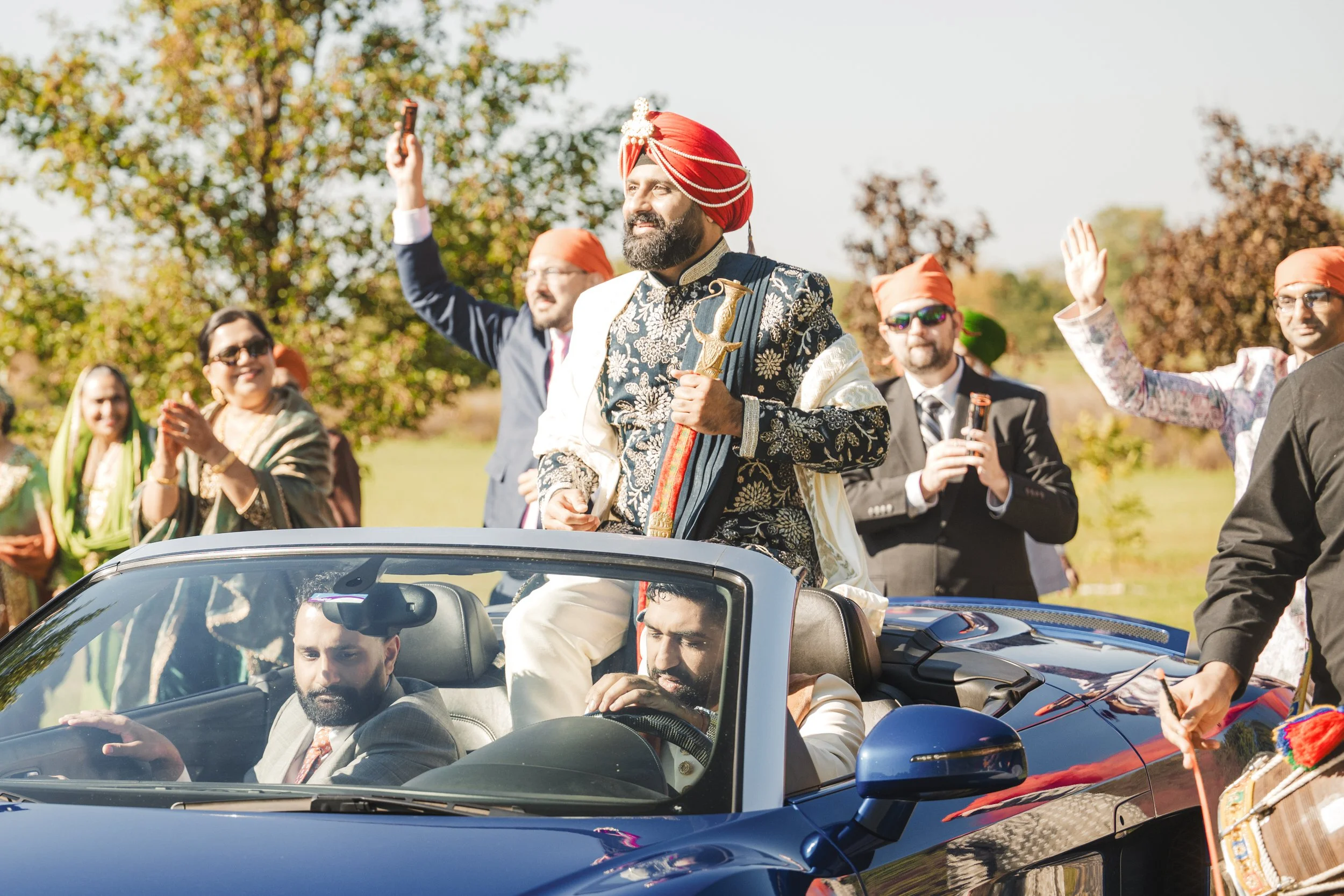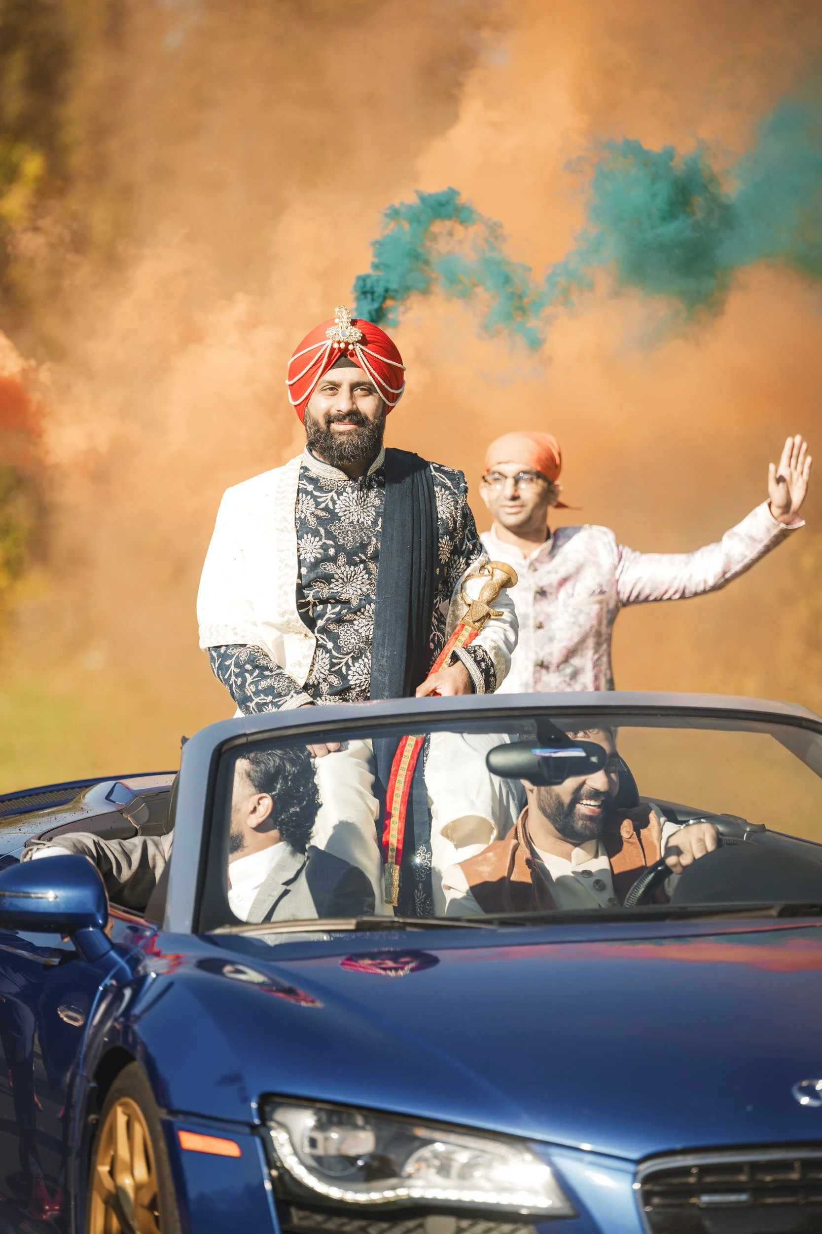 The procession was electric — vibrant beats, swirling fabrics, and nonstop smiles — as the groom was escorted toward the gurdwara, surrounded by those who love him most.
