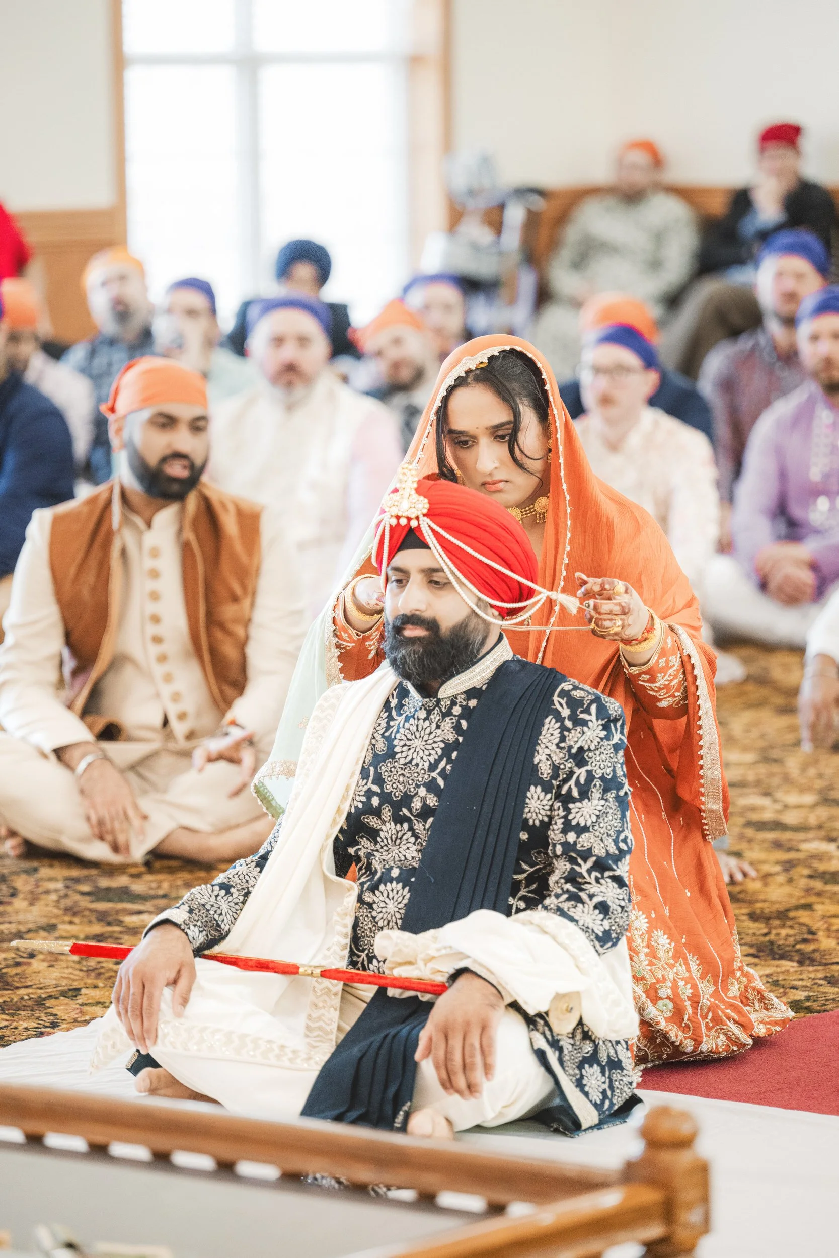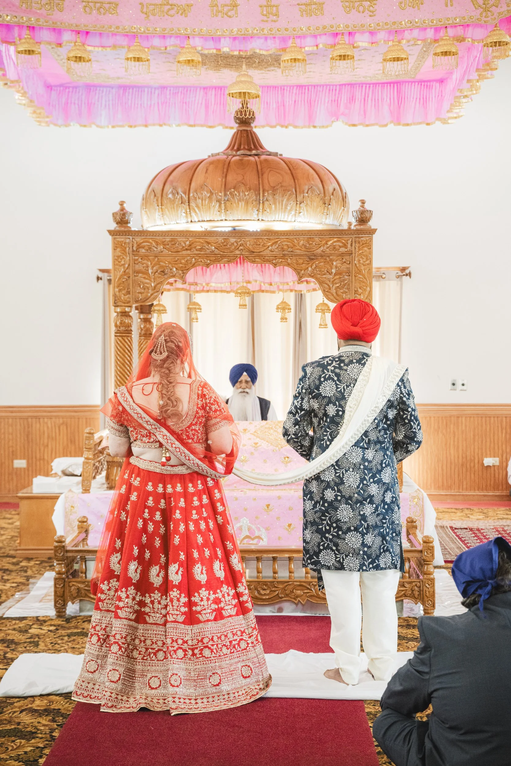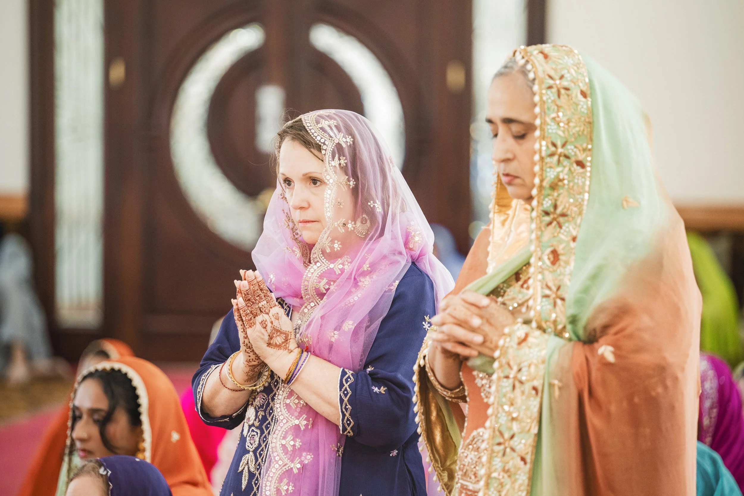 Inside, the religious ceremony unfolded with deep meaning and grace. Mubarak and Christian sat together before the Guru Granth Sahib, participating in the sacred Anand Karaj. The melodic recitation of hymns created a peaceful rhythm as they completed the four Laavaan, symbolizing their shared spiritual journey. The ceremony was intimate and reverent, rich with symbolism and devotion.