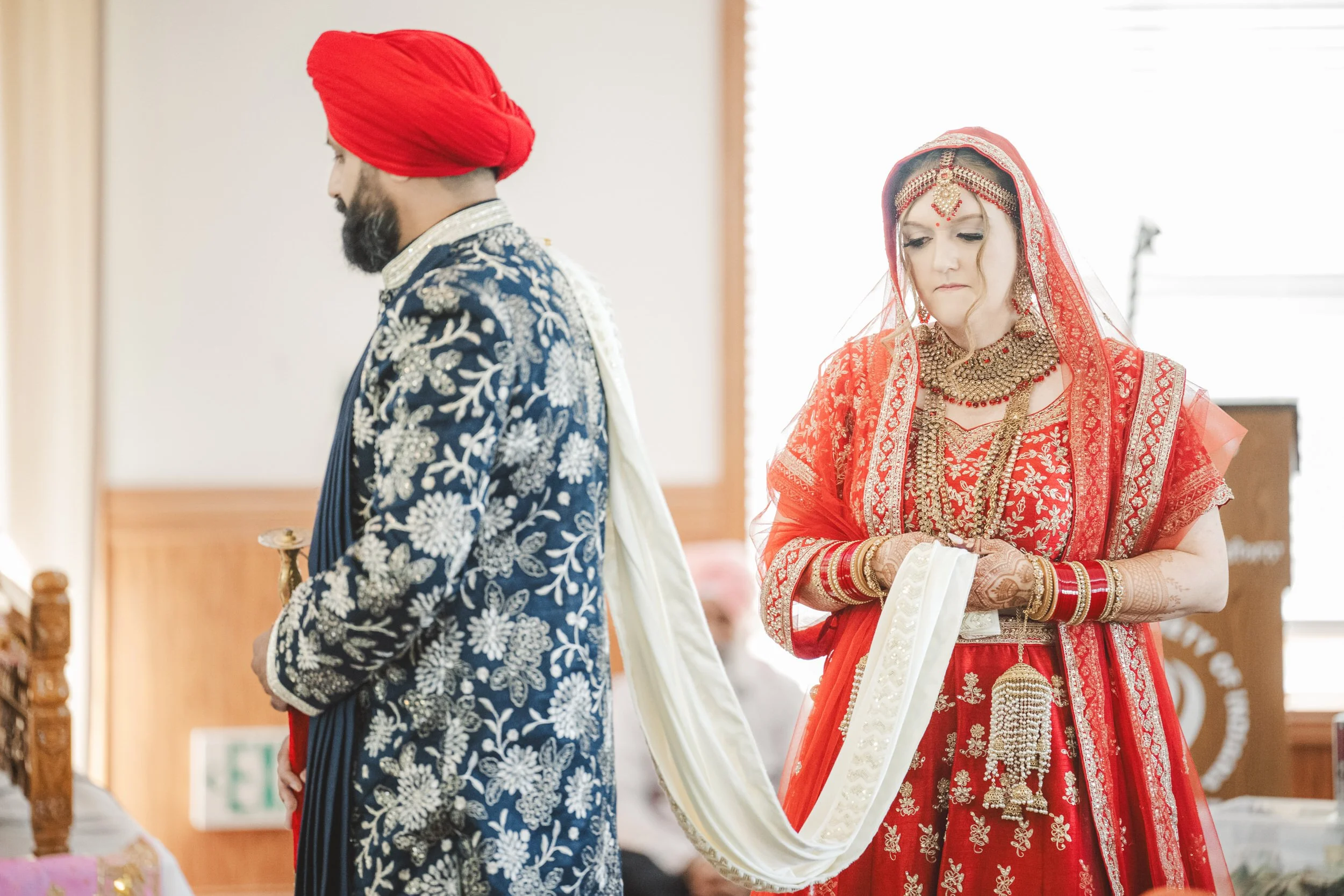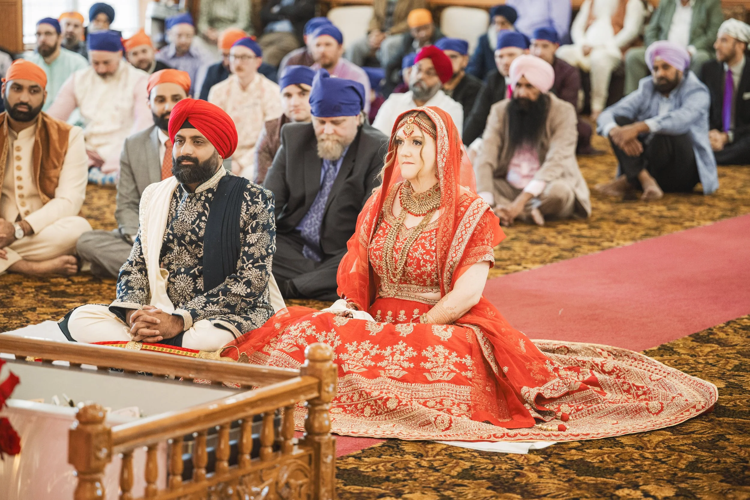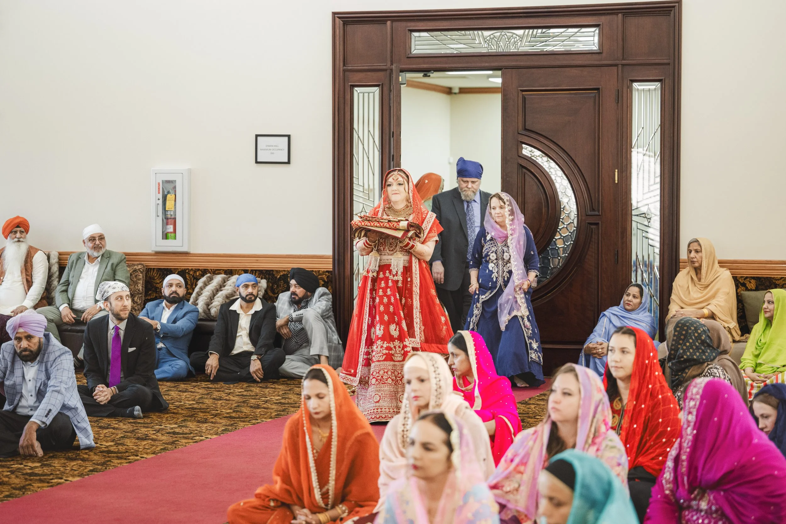 Inside, the religious ceremony unfolded with deep meaning and grace. Mubarak and Christian sat together before the Guru Granth Sahib, participating in the sacred Anand Karaj. The melodic recitation of hymns created a peaceful rhythm as they completed the four Laavaan, symbolizing their shared spiritual journey. The ceremony was intimate and reverent, rich with symbolism and devotion.